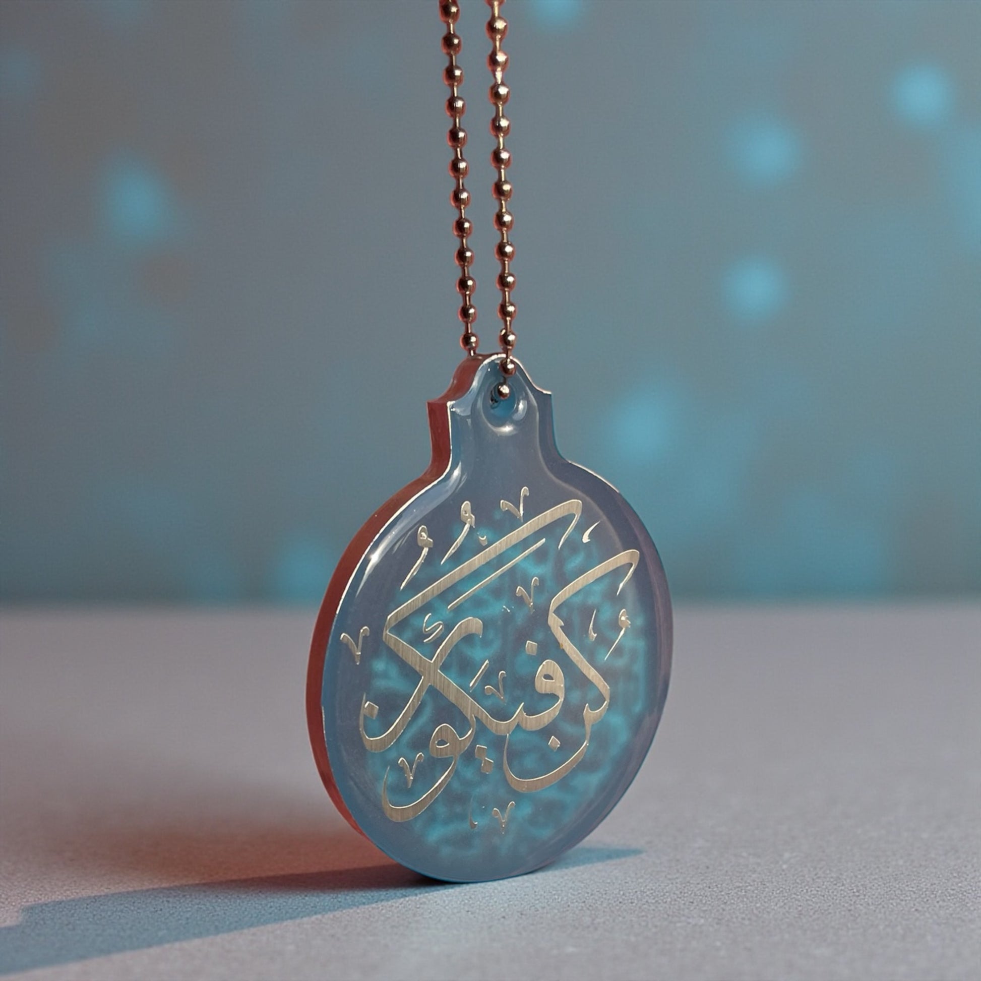 This handcrafted blue resin hanging features the inspiring Kun Faya Kun calligraphy in a striking silver finish. The piece includes a subtle neon powder glow effect that enhances its appearance under light. Designed with a smooth glossy surface, it’s ideal for hanging in the car, bedroom, workspace, or as a meaningful spiritual gift. A beautiful blend of Islamic art and modern resin craft.