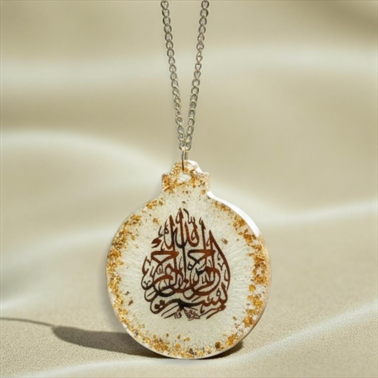 A stunning white and gold resin hanging featuring elegant Islamic calligraphy and shimmering gold leaf. Designed to add a soft, elegant charm to your car interior — perfect as a gift or personal keepsake.