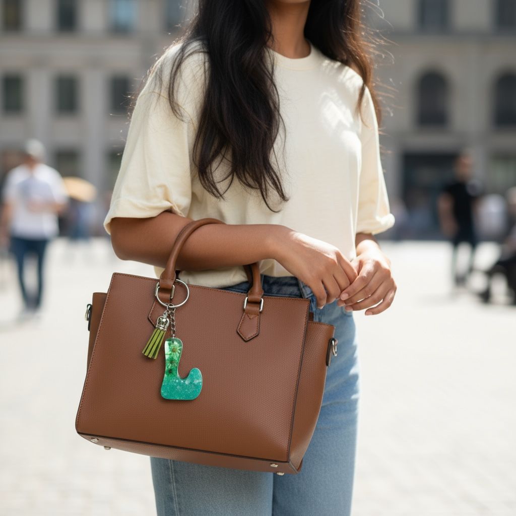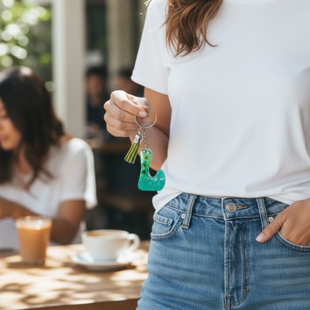 Green Resin Initial Keychain – Dried Flowers & Sequins