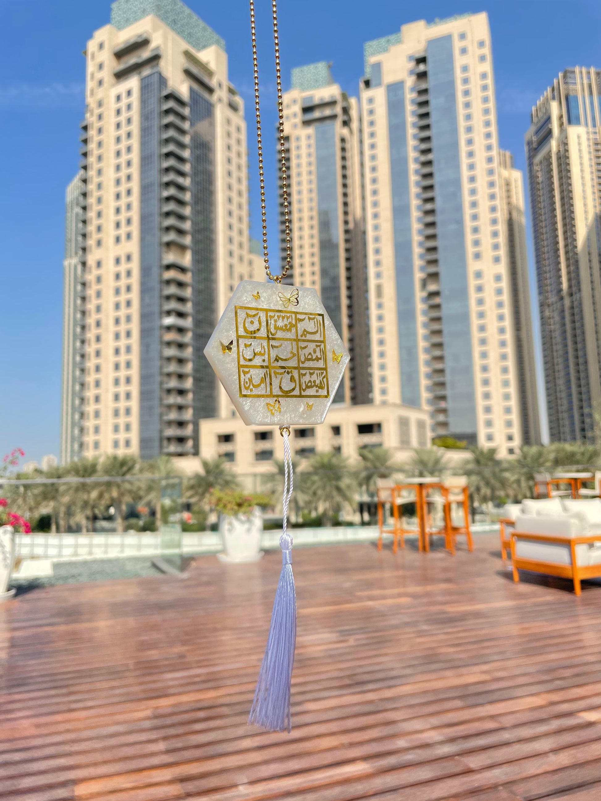 White Calligraphy Car Mirror Hanging - Hexagonal